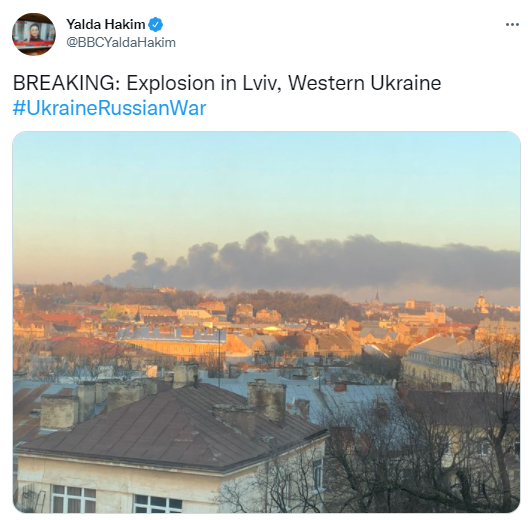 根据社交媒体上发布的多段视频,据称可以看到烟雾从利沃夫国际机场附近升起,而机场距市中心约6公里,约合3.7英里。