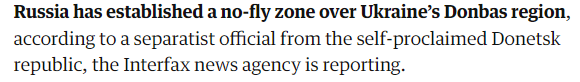 FX168财经报社(香港)讯 据国际文传电讯社(Interfax)报道,据自称顿涅茨克共和国的一名分离主义官员称,俄罗斯已在乌克兰顿巴斯地区设立禁飞区。乌克兰利沃夫市市长表示,俄爆炸袭击机场附近,仍在紧急厘清情况。