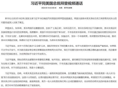 FX168财经报社(北美)讯 北京时间周五(3月18日)晚,中国国家主席习近平应约同美国总统拜登视频通话。两国元首就中美关系和乌克兰局势等共同关心的问题坦诚深入交换了意见。