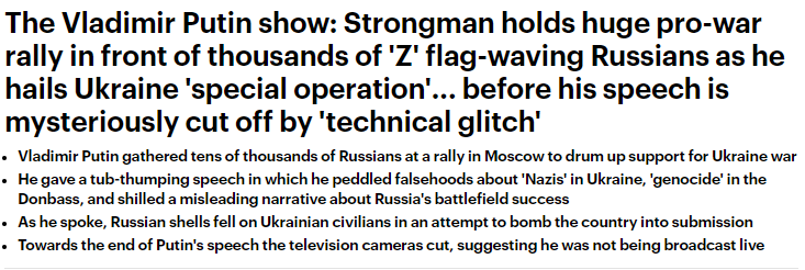 在普京讲话时,国家电视台短暂地切断了他的讲话,并播放了早些时候预先录制的爱国歌曲片段,但这位克里姆林宫领导人后来又出现在国家电视台上。
