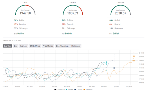 尽管近期技术面前景转跌,但FXStreet Forecast Poll显示,专家预计金价下周将反弹至1950美元。一个月观点显示出压倒性的看涨倾向,平均目标价为1987美元。