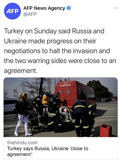 土耳其总统埃尔多安的顾问卡林(Ibrahim Kalin)也向《半岛电视台》(Al Jazeera)表示,俄乌在4项主要议题上立场“愈趋相近”,包括乌国放弃加入北约、去军事化及乌国境内俄语的保存等。