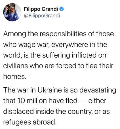 周日,联合国难民事务高级专员公署(UNHCR)高级专员Filippo Grandi在推特上发文表示,已有1千万人在乌克兰战争爆发后逃离家园,有些在乌克兰境内流离失所,有些则前往他国沦为难民;迄今越境避战的难民总数将近340万,绝大多数是前往波兰。