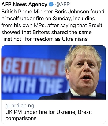 FX168财经报社(香港)讯 当地时间3月19日,英国首相约翰逊(Boris Johnson)在一场演讲中语出惊人,将英国与乌克兰相提并论,称英国人选择脱欧和乌克兰人民的“斗争”一样,都是“为了自由”。他的言论引起了欧洲多国政治家的愤怒以及英国国内反对脱欧人士的愤怒。