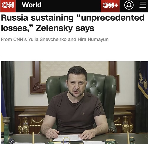 但CNN称,无法独立核实泽连斯基有关“俄军遭受重大损失”的说法。
