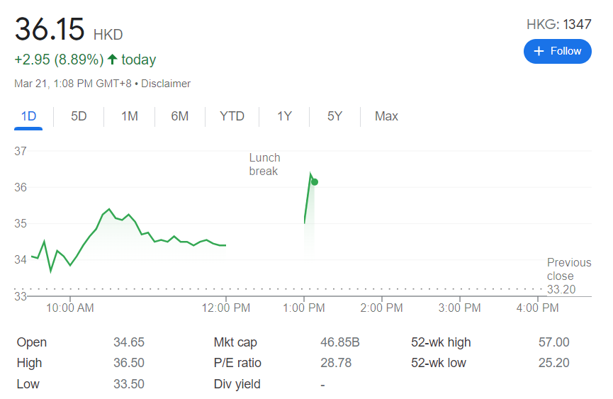 消息传出后,华虹半导体21日午盘后股价飙涨,股价走势图如下:
