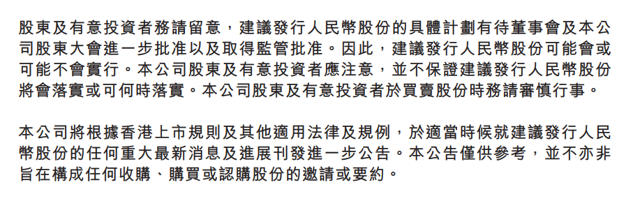 “本公司股东及有意投资者于买卖股份时务请审慎行事。本公司将根据香港上市规则及其他适用法律及规例,于适当时候就建议发行人民币股份的任何重大最新消息及进展刊发进一步公告。本公告仅供参考,并不亦非旨在构成任何收购、购买或认购股份的邀请或要约。”公告中写道。