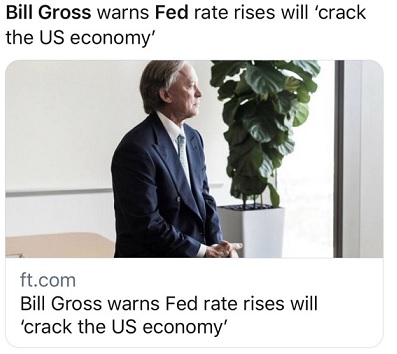 FX168财经报社(香港)讯 “债券之王”、太平洋投资管理公司(Pimco)创始人比尔·格罗斯(Bill Gross)近日发出警告称,美联储(FED)激进加息行动将可能会破坏美国经济。如果美国把利率提高到2.5%-3%之上,则可能会“破坏美国经济”。