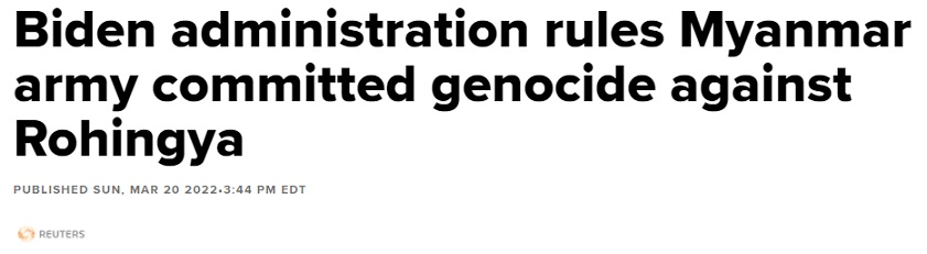 FX168财经报社(香港)讯 美国官员周日(3月20日)表示,拜登政府已正式认定,缅甸军方对罗兴亚少数民族实施的暴力行为构成种族灭绝和反人类罪。支持者相信,此举有助让缅甸军政府负起相关责任。