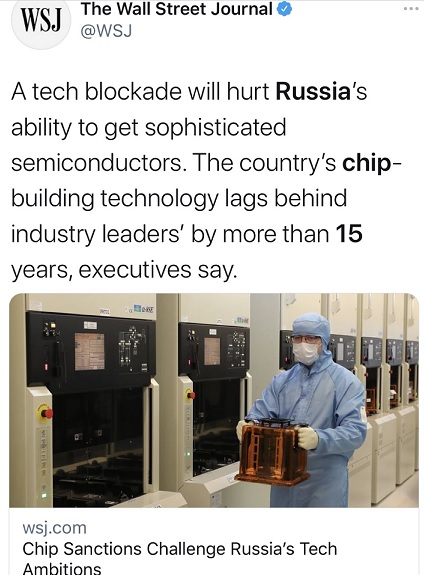研究过俄罗斯工业状况的西方半导体行业高管表示,俄罗斯的芯片制造技术要落后行业领头羊台积电15年以上。而日本断供关键材料和设备也将加剧俄半导体制造的难度。