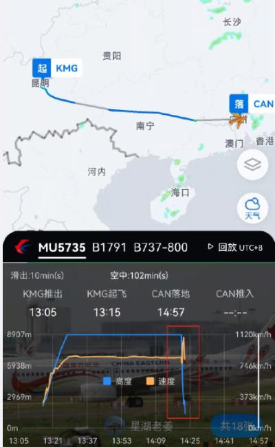 据多个航空媒体微博:东方航空MU5735由昆明飞往广州,根据Flightradar24显示,速度和高度在梧州附近出现骤降,该飞机正常的落地时间应为下午15:05。