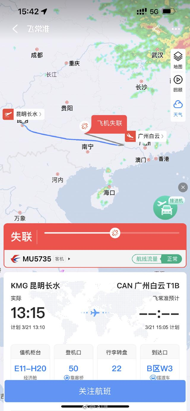 通过白云机场官方小程序查询航班动态发现,MU5735原计划于3月21日13时10分在昆明长水起飞,14时52分到达广州白云国际机场,目前失联状态。