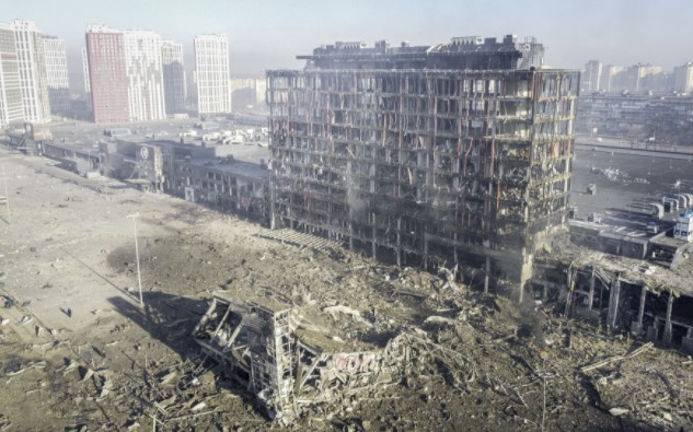 (3月21日俄罗斯在乌克兰基辅发动炮击后 Retroville购物中心鸟瞰图)