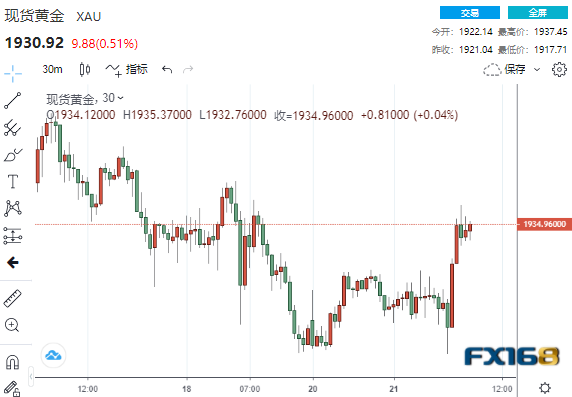 现货金短线拉升近20美元,刷新日高至1937.45美元,现回落至1930美元附近交投。