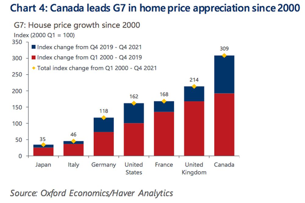 牛津经济研究院认为,此次调整有3个触发因素。首先,或许也是最重要的,是市场本身。该报告称,到2021年底,加拿大的房价超出了中等收入家庭的借贷能力19%,而自那以后的上涨让情况变得更糟。牛津经济研究院预计,到今年年中,房价将比普通家庭能够承受的水平高出38%,这是前所未有的。