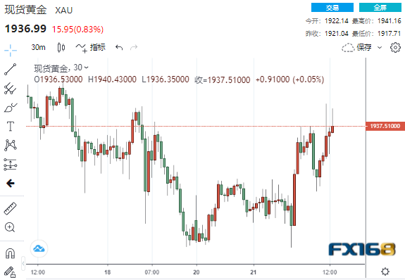 美市盘中,现货黄金一度向上触及1940美元/盎司,日内涨超1%。