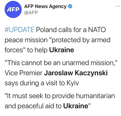 卡钦斯基15日提出在乌克兰执行国际维和任务的构想,由北约组织或“更广泛的国际条约”来执行,未料到《NEXTA》3月21日晚间在推特称,“在波兰领导人宣布可能派出维和部队前往乌克兰后,俄罗斯派出战斗轰炸机进入波兰领空。”