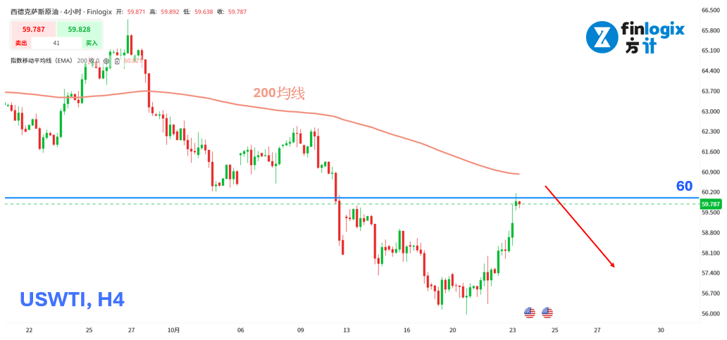 技术面:川普宣布取消与俄罗斯总统的会面,同时对俄罗斯两家最大石油公司实施新一轮出口制裁。中东局势方面,以哈之间的停火协议依旧脆弱,虽短暂维持约36小时,但随后再度爆发冲突, 地缘政治风险升温成为昨日油价上涨的主要驱动力。然而,国际能源署上周指出,明年全球油市供给过剩的情况将比今年更为严重,因此本轮油价反弹,逢高仍偏向看空交易策略。日内留意60和60.8(4小时的200均线)等阻力位,反弹止涨后有机会做空。