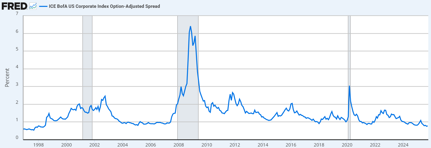 先说一下目前美国的信用市场,可谓是极其火爆,投资级债券利差和高收益债券利差都处在历史最低点,说明市场处在极度贪婪阶段。这点同样体现在隔夜回购利率市场,SOFR利率近一个月来多次突破美联储联邦利率的上限。这说明美国银行业的准备金已经接近最低下限,因此行间拆借时所采用的利率超过了准备金利率(IORB)。鲍威尔因此在本周的讲话后宣布暂停缩表,因为流动性出现压力。