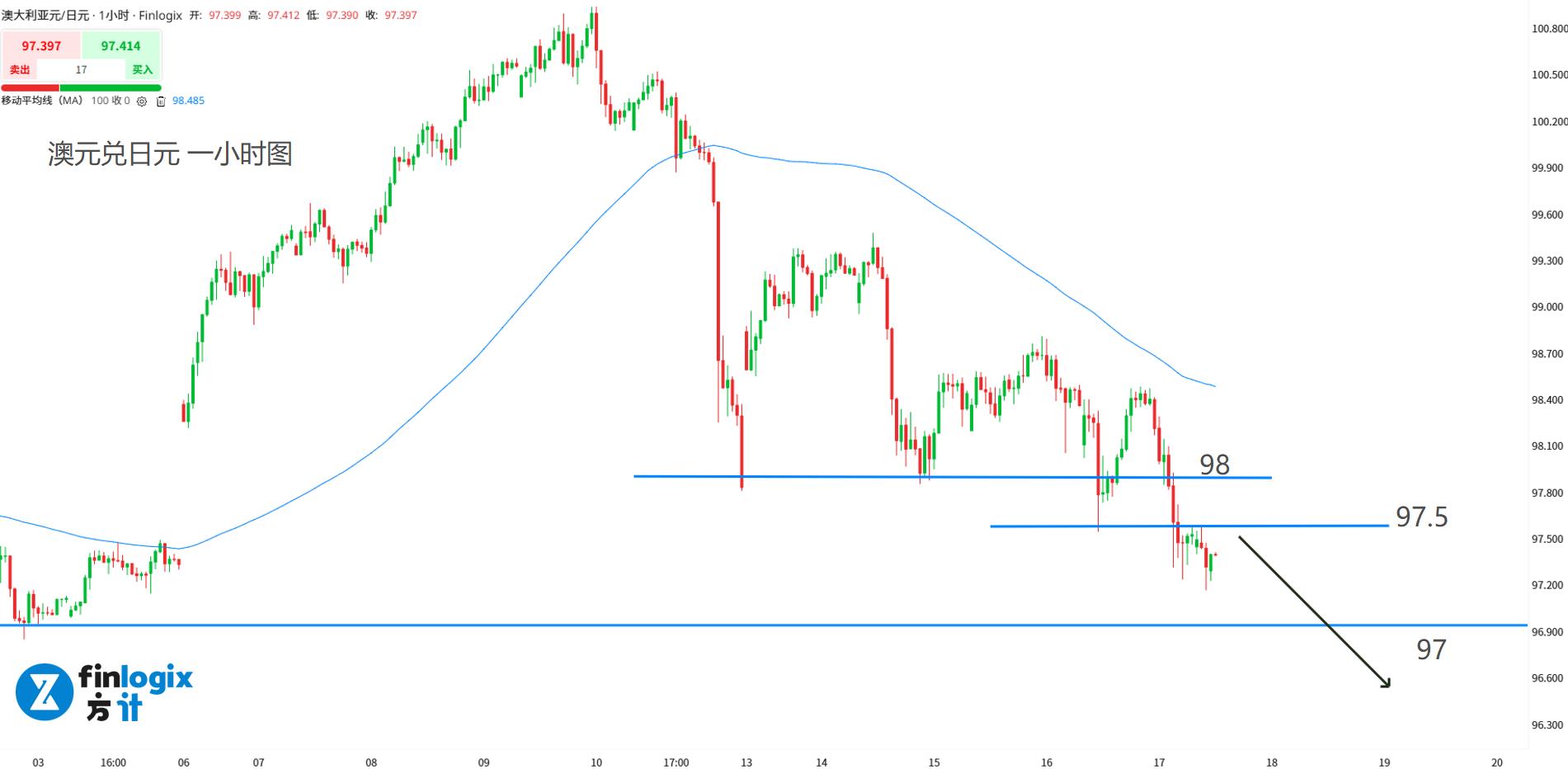 技术面:100均线向下,趋势线提供强阻力。澳日已经跌破98关口,下方目标在前低点97。该位置不一定能撑得住,因此短线空单同样可以关注跌破跟随。