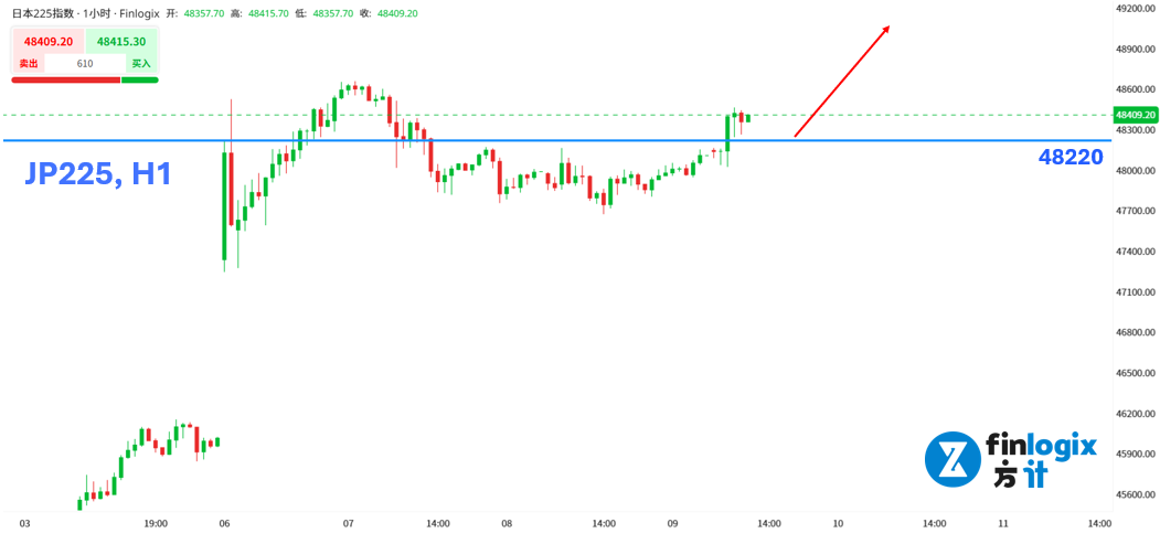 技术面:日经225指数经过周一暴涨后两日整理,短线小时图出现做多讯号,可留意介入机会。日內小时线不跌破48220,偏多交易。