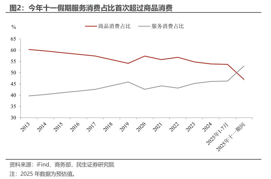 正是在这一背景下,商务部监测数据显示,10月1日至3日,全国服务消费(餐饮、文旅、娱乐等)同比增长 21%,占比首次超过商品消费,达到 53%。而随着服务消费占比突破临界点,服务消费的“天花板”就此打开。