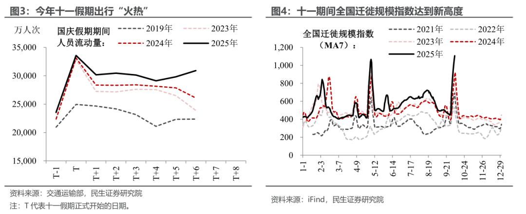 三是十一长假出行既有“新高度”,也有“新趋势”。得益于假期延长与政策刺激的协同作用,今年十一假期的出行热度迈上了新的台阶——根据交通运输部数据,今年十一假期前7天日均全社会跨区域人员流动量相较于去年同比增长6.9%;同时十一期间全国迁徙规模指数也达到新高度。