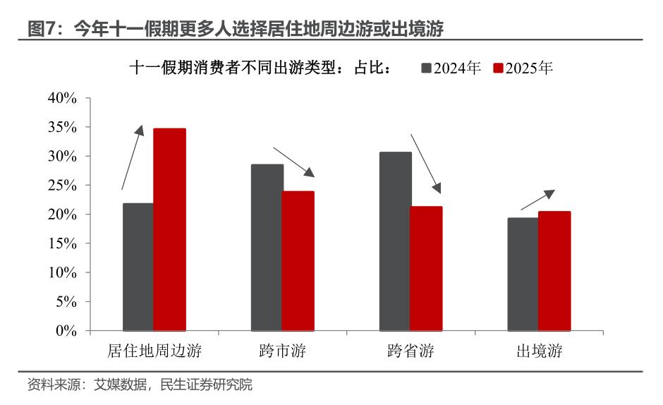 相较之下,跨省或跨市游因“高不成低不就”而吸引力下降。跨省或跨市游费用高于周边游,而体验感可能与日常生活差异不大,性价比优势减弱,因此今年十一假期选择跨省或跨市游的占比下降。