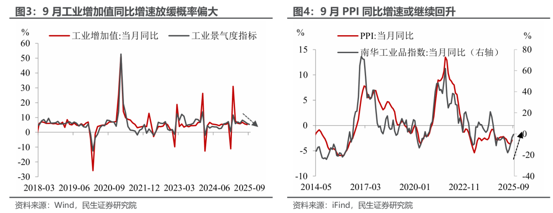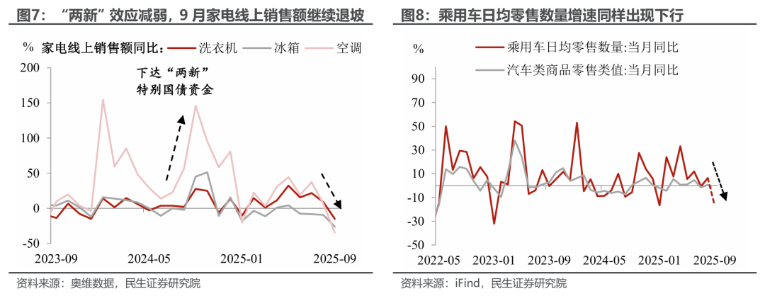 社零:政策效应渐褪色,高基数再设障。9月家电线上销售额与乘用车销量双双滑入负增长区间,随着“国补”的规范化以及资金池的告急,“两新”政策效应仍在递减。与此同时,9月社零还面临一定的高基数压力,增长放缓可能性较大。在有效需求不足的背景下,CPI增速的完全修复尚待时日。