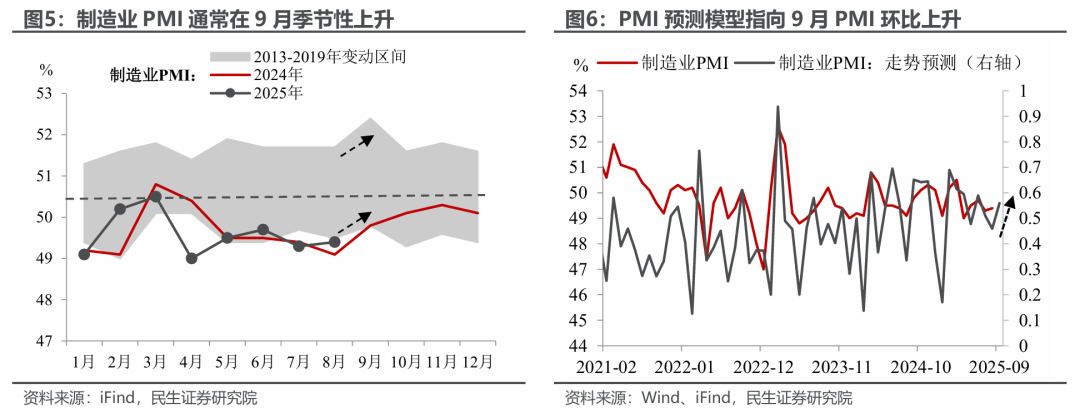 相较之下,制造业PMI在9月季节性上涨动能较强。作为环比指标,制造业PMI在9月通常随高温和极端天气的消退而季节性回升。我们的预测模型同样显示,9月制造业PMI环比上升概率较高。