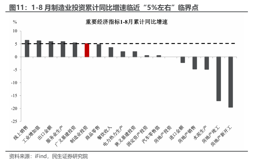 制造业投资:“5%左右”临界点的政策赛跑。作为今年经济增长的一大重要引擎,制造业投资1-8月累计同比增速已放缓至5.1%,逼近“5%左右”的经济增长目标临界点。在“反内卷”和“稳外贸”的双重压力下,当前制造业民间投资意愿踟蹰不前,此时亟待政策性金融工具的精准驰援、加大支持科技创新和产业发展的力度,为制造业投资提供更多“稳增长”动能。