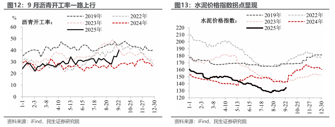 基建投资:“风雨之后现彩虹”?受到极端天气、以及基建项目融资受阻(新增专项债向化债“偏倚”、财政支出向民生“偏倚”)的影响,此前基建增速下行压力较大。不过,随着天气扰动的褪去,9月以来沥青开工率出现直线回升;在房地产尚未明显好转的情况下,水泥价格指数也显现出企稳拐点,这些高频指标均指向9月基建可能将迎来边际好转。